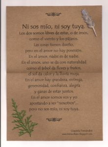 Debían ser mensajes superadores: nada de celos, ni de dramas, ni de “sin vos mi vida no tiene sentido”, ni de “soy tuya, sos mío”. No, no y no. Quería que mis tarjetas fueran simples, sí, pero profundas, y que trasmitieran la idea de respeto por el otro, por la libertad del otro y por la propia libertad, que hablaran del perdón, de vivir el presente, del compromiso genuino.